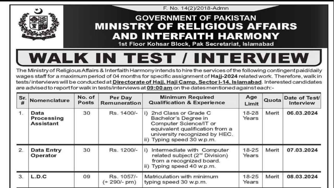 Ministry of Religious Affairs and Interfaith Harmony Jobs 2024 Online Apply via www.mora.gov.pk