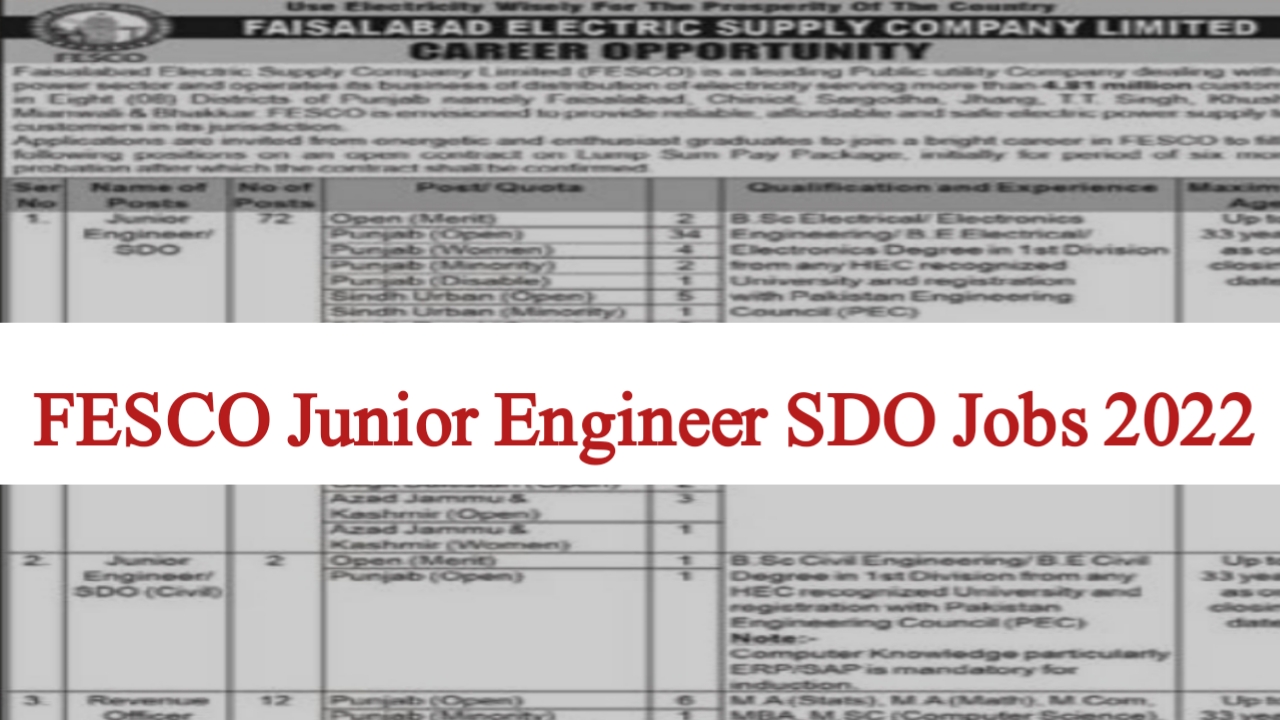 FESCO Junior Engineer SDO Jobs 2022-Apply via www.nts.org.pk