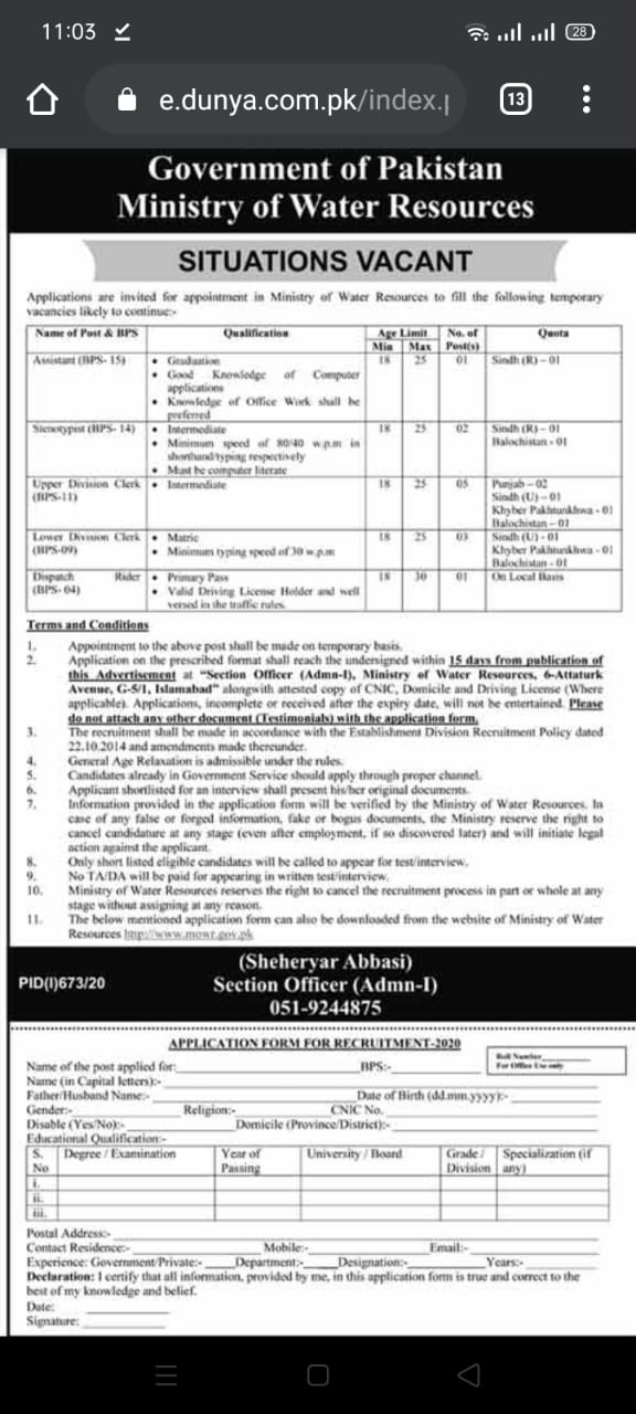 Govt Pakistan Ministry of Water Resources jobs