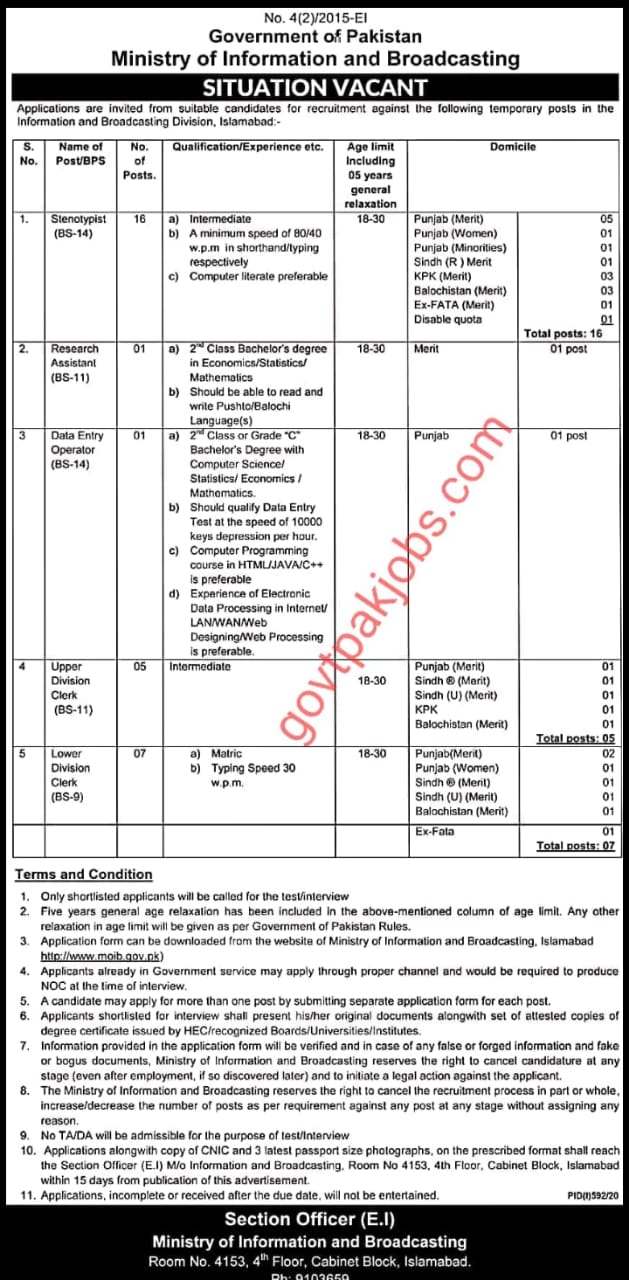 Ministry of Information and Broadcasting Jobs Islamabad
