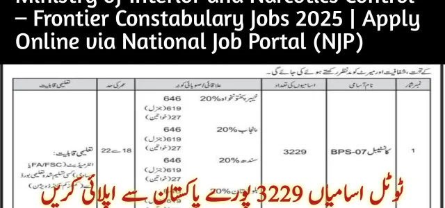 The Ministry of Interior and Narcotics Control – Frontier Constabulary has officially announced 3,229 new job vacancies, bringing excellent news for students across the country. This recruitment drive is open to all students from all over Pakistan, giving them a golden chance to join a respected government institution. The advertisement was released on August 7, 2025, and the last date to apply is August 22, 2025. Applications can only be submitted online through the National Job Portal (NJP) at http://njp.gov.pk. The required qualification to apply is a minimum of FA/FSc or equivalent.