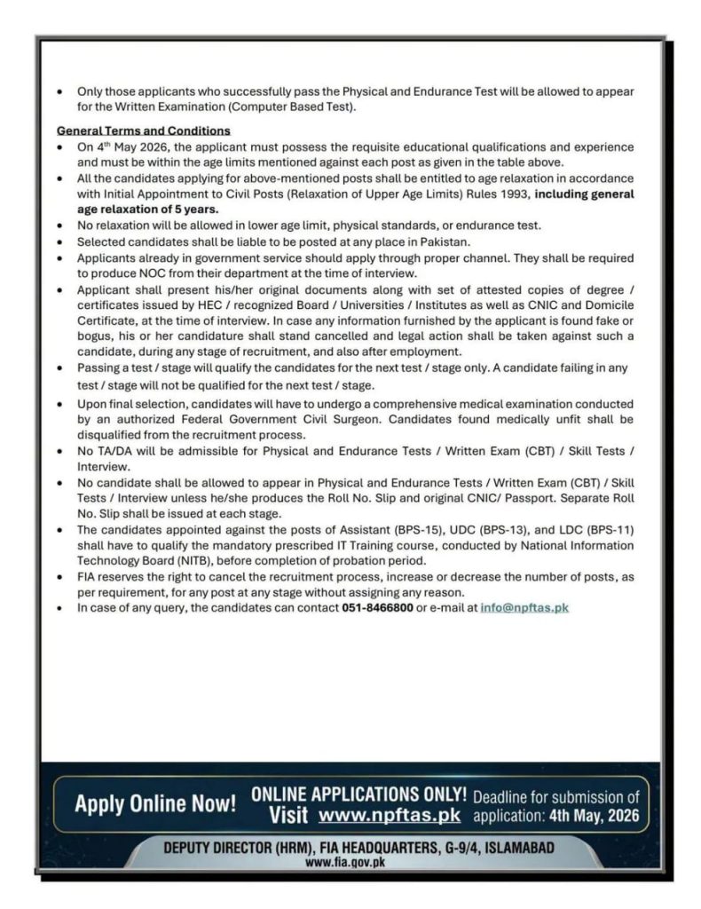 FIA has announced 1,394 government jobs in April 2026. The last date to apply is 4th May 2026. All applications must be submitted online at www.npftas.pk — no other method is accepted.